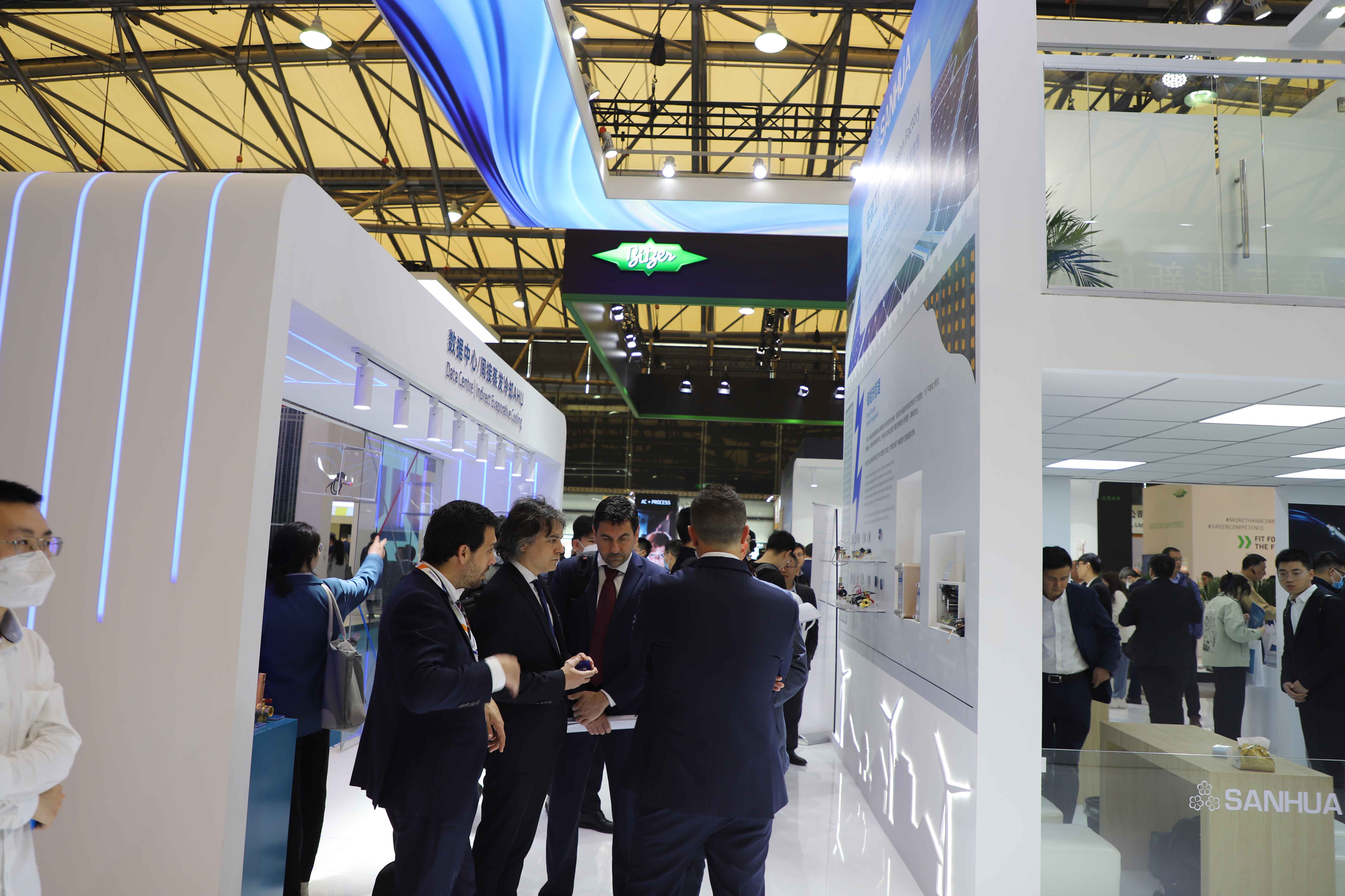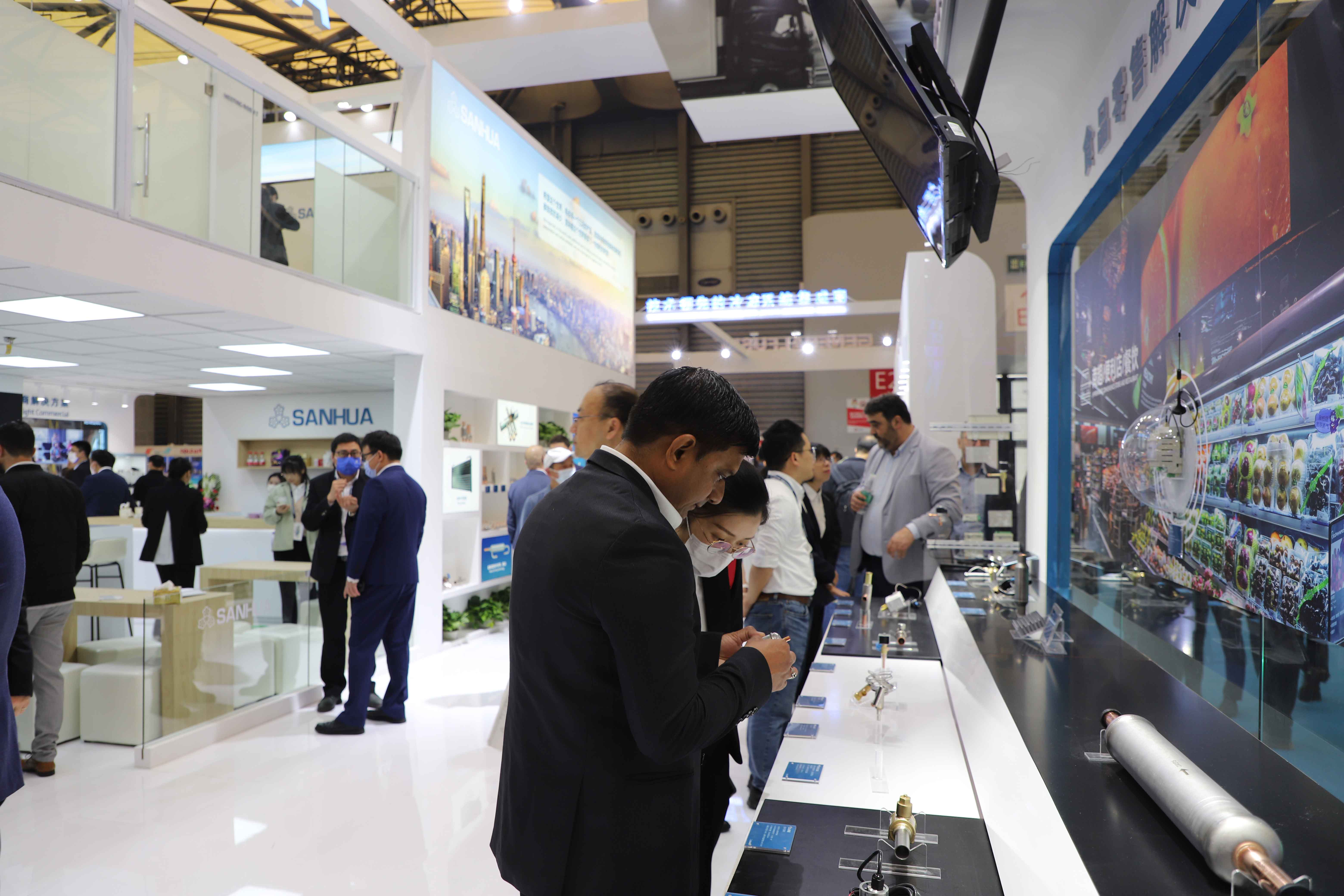 三花展臺內(nèi)涵豐富,科技感十足,成為展會最為火熱的展臺之一。三花諸多新老客戶不斷前來三花展臺,述舊情看新品,共話合作新未來。三花商用制冷總經(jīng)理陳雨忠來到展臺現(xiàn)場,與客戶親密交流,共探創(chuàng)新展品。